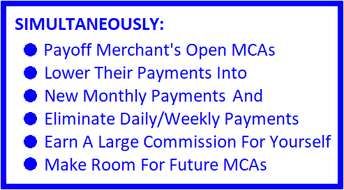 Great job! You got a Merchant approved for an MCA loan! But did you ask them if they have real estate? Did you ask them if they would be interested in another loan…in addition to the MCA loan you just got them approved for? If they say yes, which they will 9 out of 10 times, then you have another opportunity for a commission…just send me their contact information and I’ll take it from there. You don’t have to do anything else…I’ll do all the work and when I close the loan, I’ll pay you full commission for the referral.