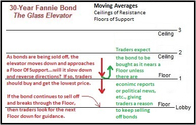 A good way to think about how traders analyze Floors and Ceilings is to visualize a glass elevator in a hotel. Bonds are the glass elevator…when traders buy bonds the glass elevator goes up and when they sell off bonds the glass elevator goes down. Got that? Good. Now visualize traders are buying lots and lots of bonds…the bond elevator is going up and passes a Ceiling and then it continues to go up and passes another Ceiling. When it reaches the top traders start selling off bonds and now the bond elevator heads down and passes a Floor and then passes another Floor. Keep that picture in your head.