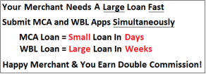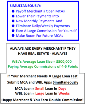 Go ahead, fund the MCA loan now AND apply to WBL for another much larger loan. For a WBL loan, the Merchant needs real estate… virtually any property will do as long as there’s equity in it. If there is, you’ll earn another commission when we close. Your Merchant will be very happy because you’ll get them money fast with the MCA loan and then 3 weeks later you’ll get them an even bigger loan with WBL.